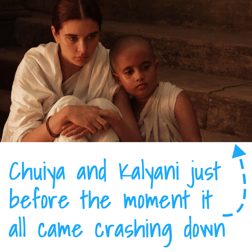 Fascinatingly, while passive water drenches these women every moment of their waking lives, the only time the director depicts fire around them is when they are actively choosing their destiny. I’ll highlight this more in the subsequent thematic analysis of the movie. Chuyia is devastated by the loss of her friend and seeks revenge by strangling Madhumati’s pet parrot, the only time the guileless girl commits a brutal act. Although she regrets the murder immediately, the blows to her innocence are quick to follow when Madhumati, now lacking a resource for her old business, sends Chuyia across the river to be defiled. Thus, while the romantic arc between Narayan and Kalyani ends in abject tragedy, the heavy consequences are borne by Chuyia.